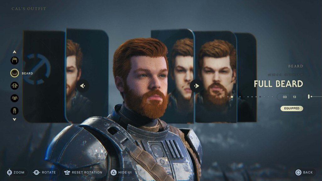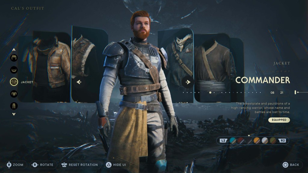In addition to the jackets, players can customize Cal’s pants and shirt with a series of color themes. The same is true for his lightsaber, blaster, BD-1’s look and Cal’s hair and facial hair style.