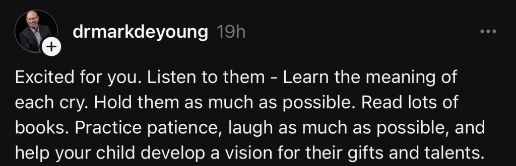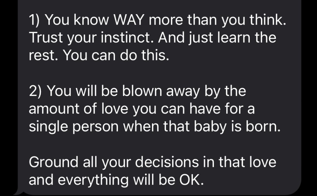 I liked this advice because it’s something I’ve wanted to set out to do from Day 1. I want to make sure I tell my kiddo that I love them—both with words and through action. The relationship I have with my dad is great, but I must mention I don’t remember ever hearing my dad say he loved me prior to 2016 after a bout with prostate cancer. He’s said it nearly every time we get off the phone now, and that’s comforting. And don’t get me wrong, my dad provided for our family and through action he showed his love, but I believe it’s important to vocalize it. The five love languages (words of affirmation, gift giving, quality time, acts of service, and physical touch) isn’t exclusive to romantic relationships, and so it’s okay to provide a roof over the head of your family as an act of love, but also to spend quality time with them and give hugs to express that love in different ways.